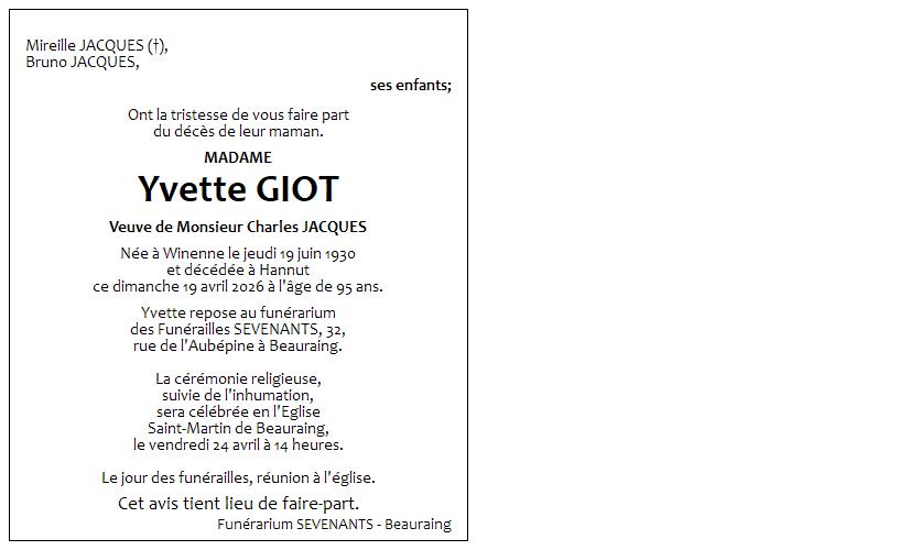 Avis de décès de Madame Yvette GIOT