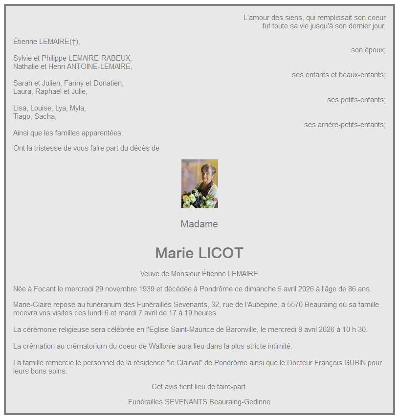 Décédée à Pondrôme (5574) le dimanche 5 avril 2026 à l'âge de 86 ans