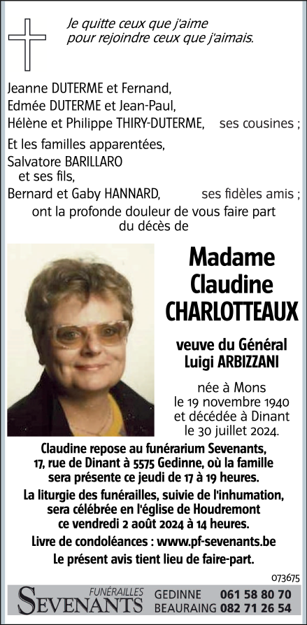 Décédée à Dinant (5500) le mardi 30 juillet 2024 à l'âge de 83 ans