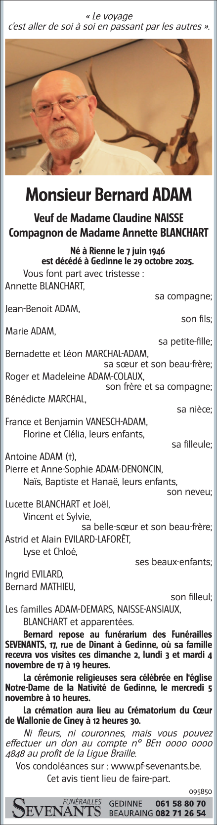 Décédé à Gedinne (5575) le mercredi 29 octobre 2025 à l'âge de 79 ans