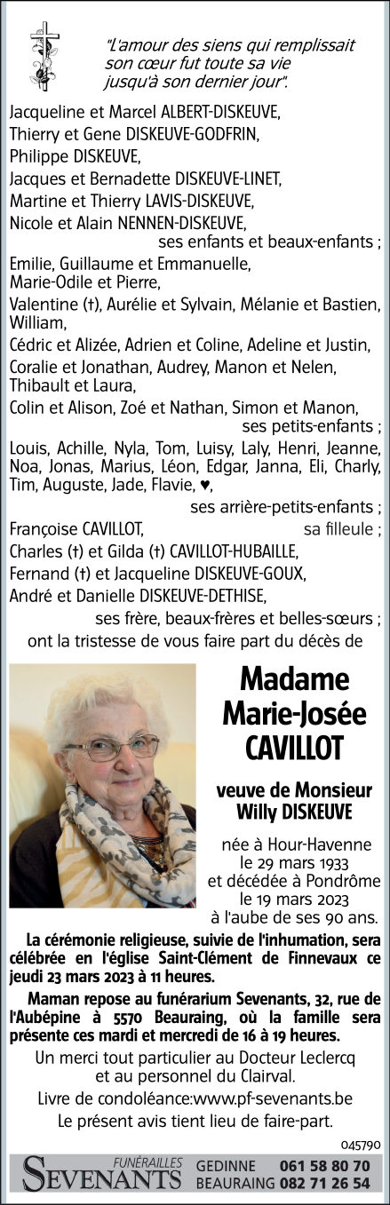 Décédée à Pondrôme (5574) le dimanche 19 mars 2023 à l'âge de 89 ans