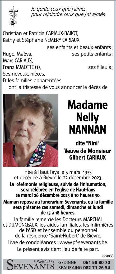 Décédée à Bievre (5555) le vendredi 22 décembre 2023 à l'âge de 90 ans
