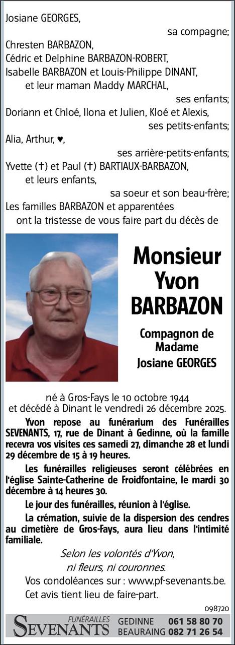 Décédé à Dinant (5500) le vendredi 26 décembre 2025 à l'âge de 81 ans