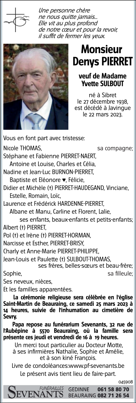 Né à Sibret (6640) le mardi 27 décembre 1938