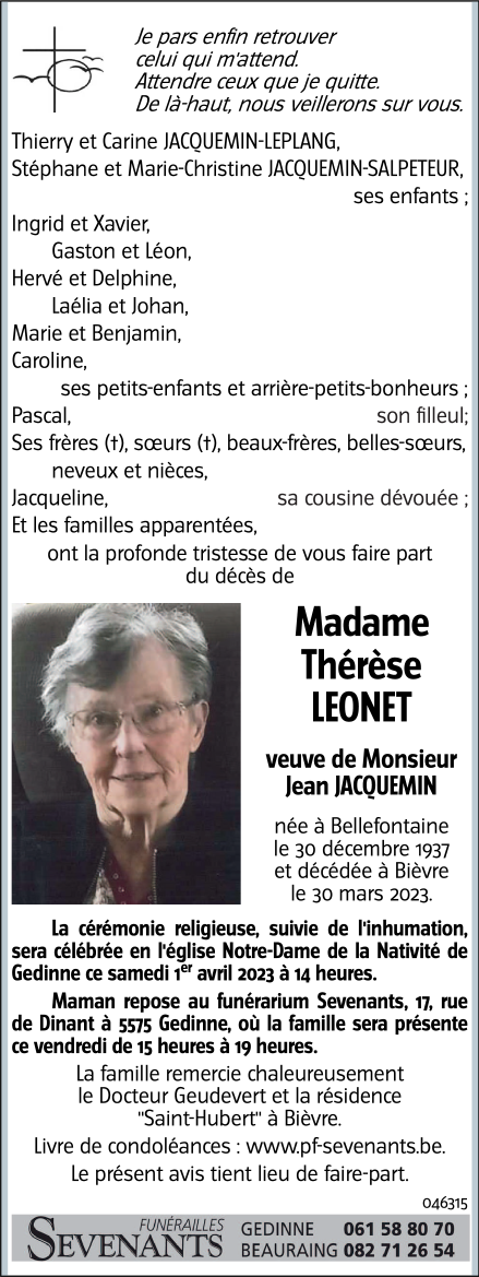 Décédée à Bievre (5555) le jeudi 30 mars 2023 à l'âge de 85 ans